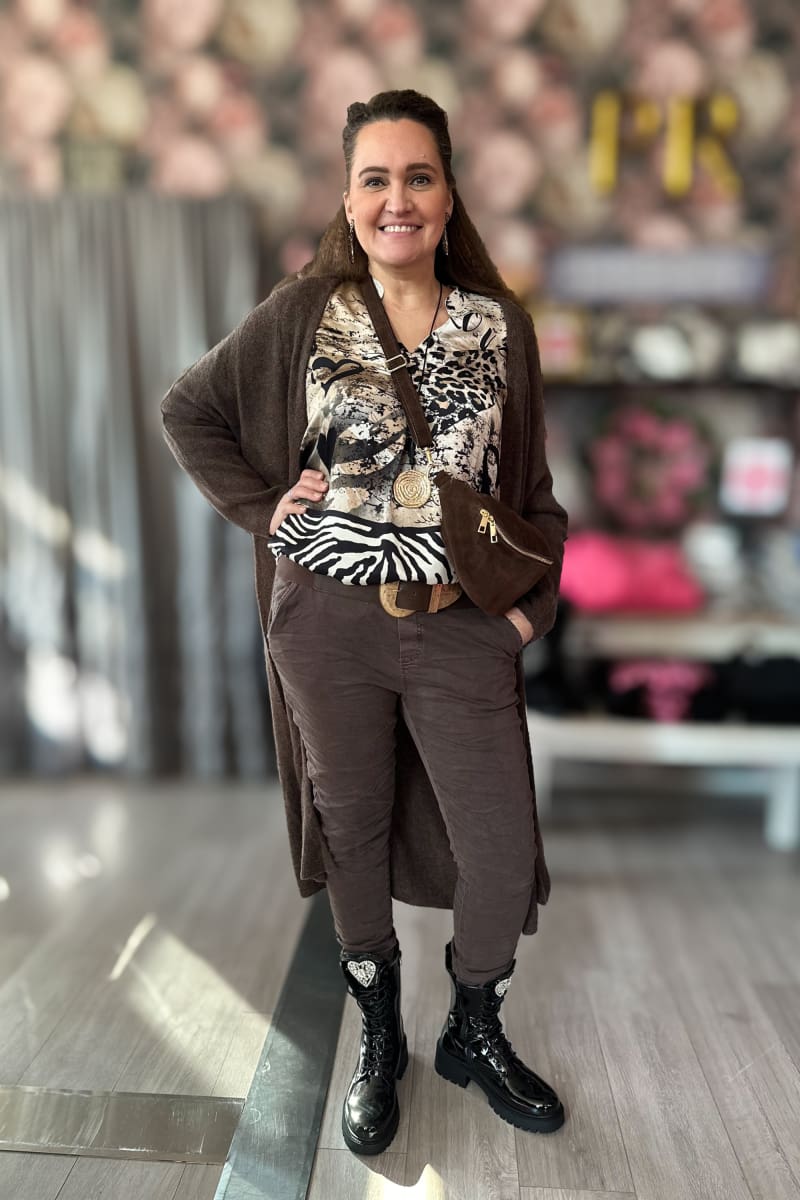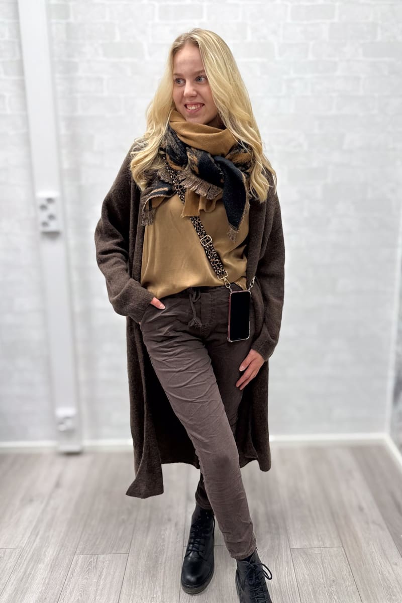 - Hyvin joustava farkku, jossa etu- ja takataskut ja kuminauhavyötärö nauhalla