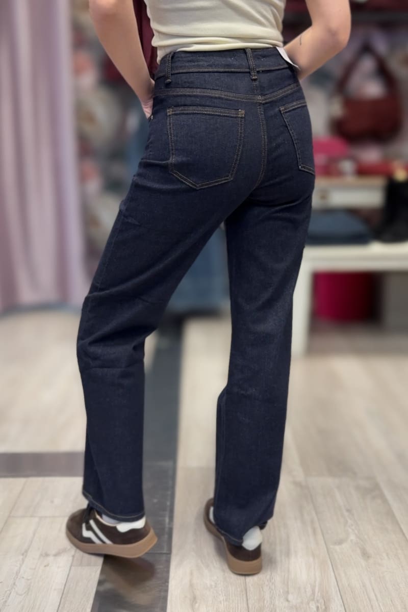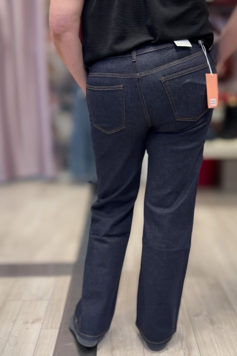 - Tuttu Goodies-farkku tummana farkkuna leveällä lahkeella