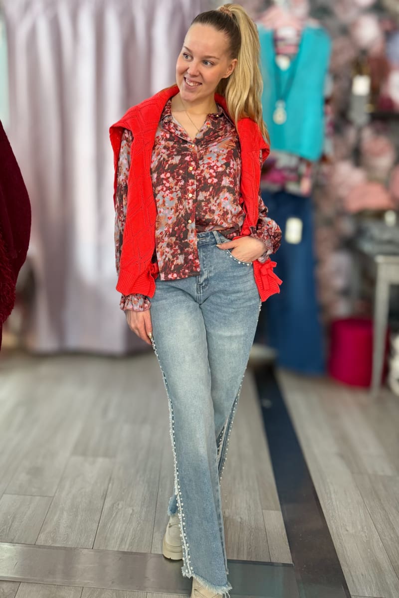 Upea farkku, jossa sivuilla rispattua sekä helmikoristeita.