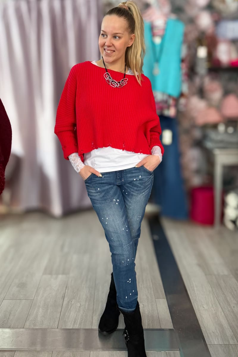 Ihana puuvillaneule, jossa revittyjä yksityiskohtia. Värinä kirkas punainen