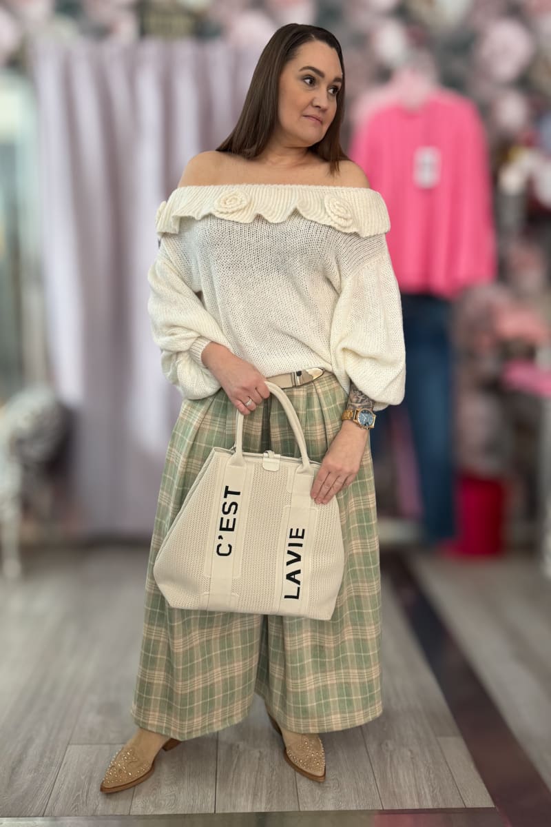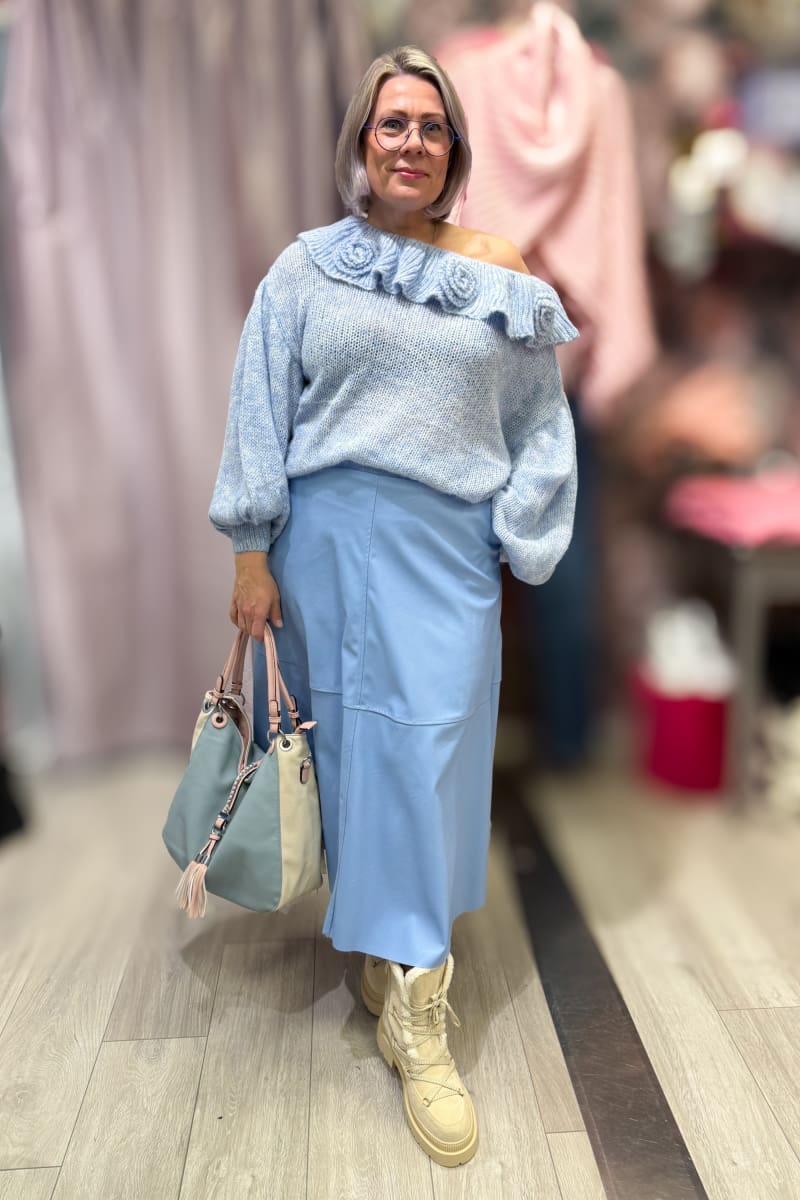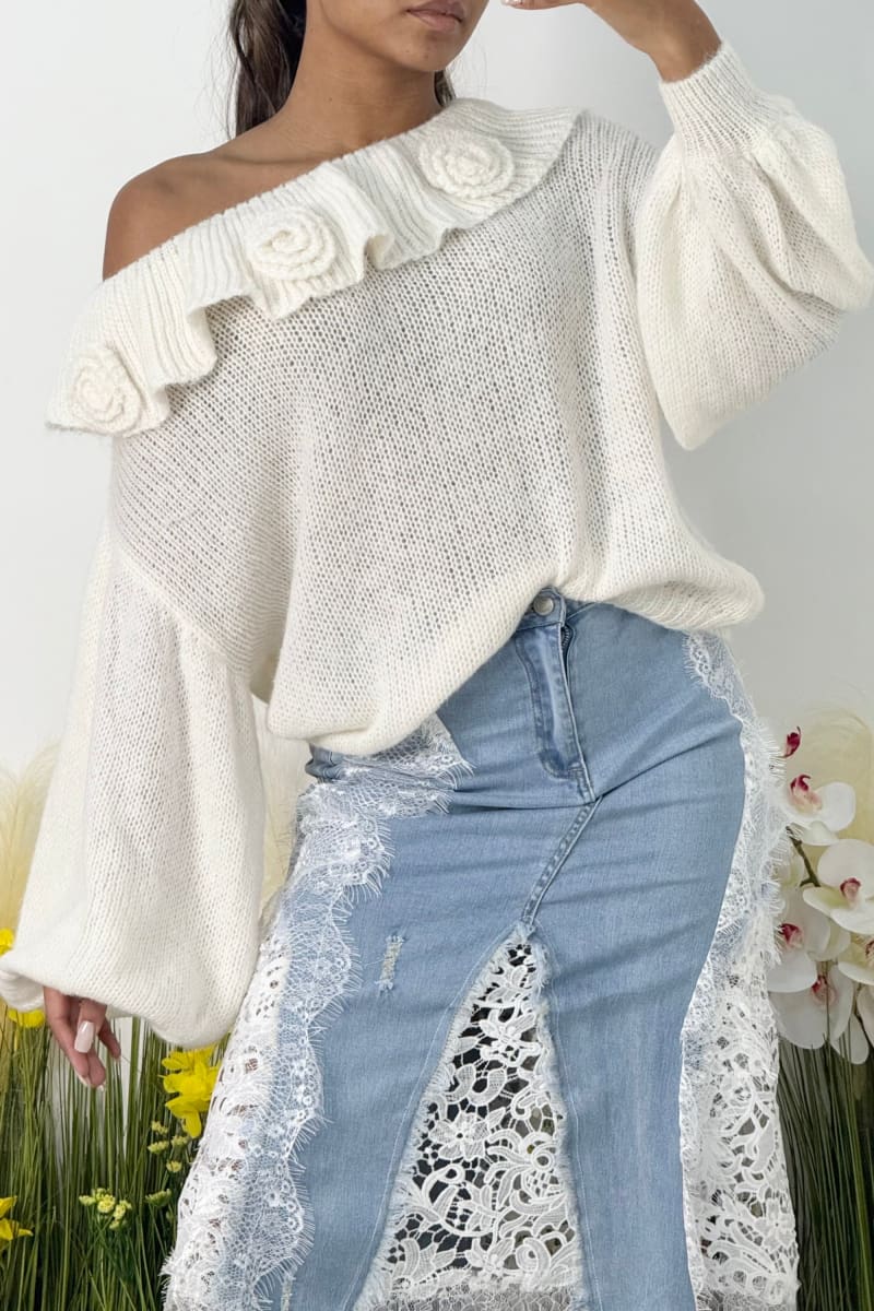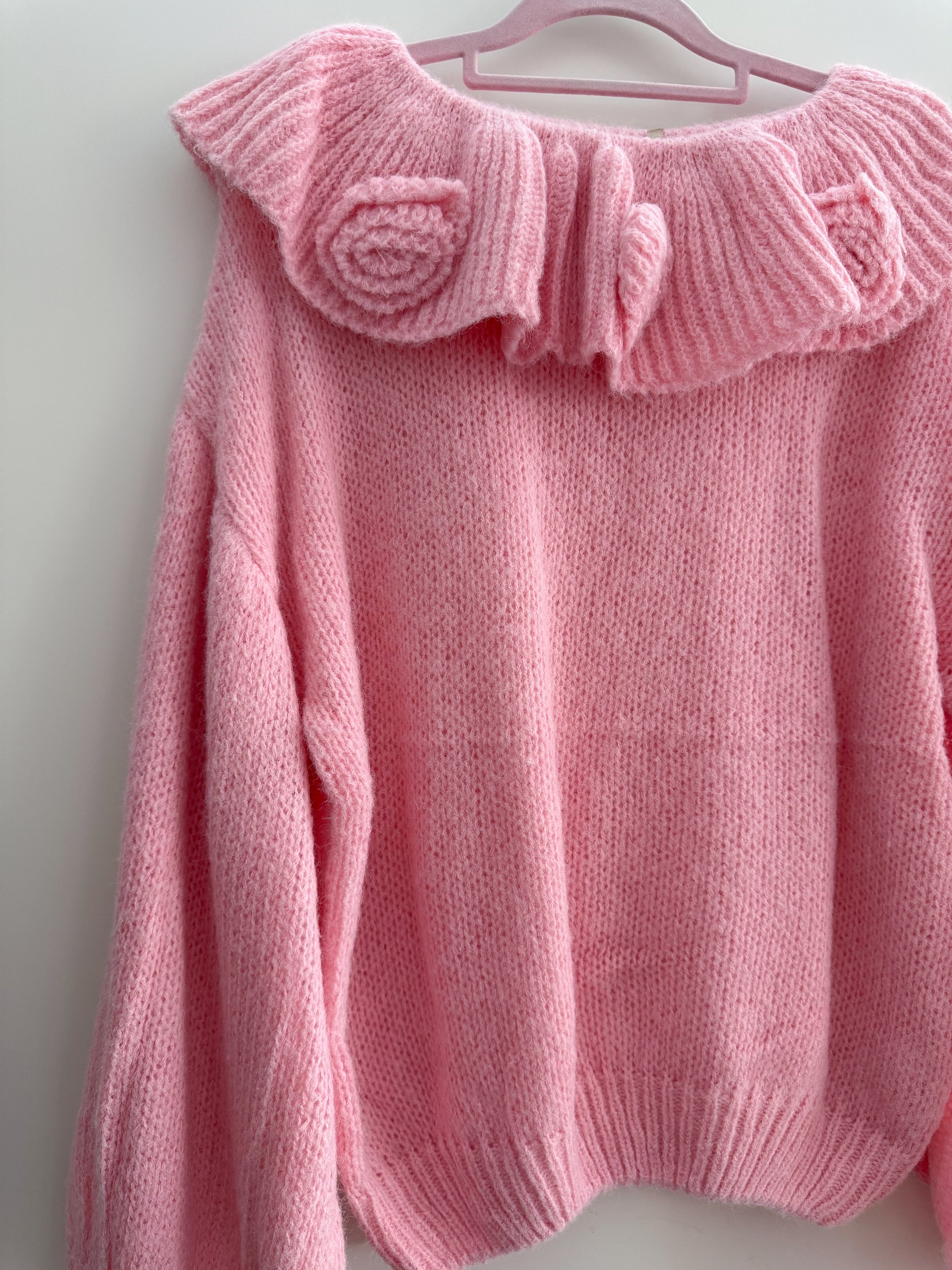 - Ihana neule, jossa röyhelökaulus ja koristekukkia