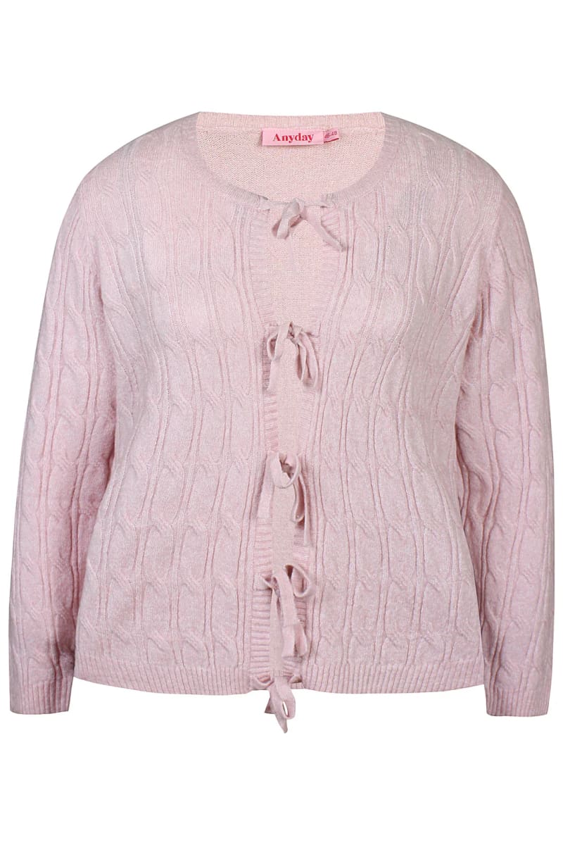 Tämä romanttinen neuletakki ruseteilla on täydellinen valinta, kun haluat pukeutua naisellisesti mutta mukavasti. Kaunis palmikkokuviointi tuo neuleeseen ryhtiä ja tekee siluetista imartelevan. Suloiset rusettiyksityiskohdat lisäävät herkkää ja hienostunutta ilmettä, joka erottuu edukseen ilman että kokonaisuus tuntuu liian juhlavalta.