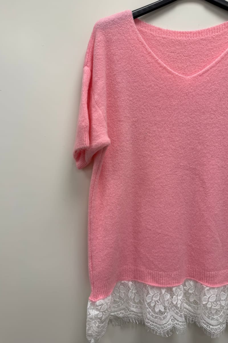 Pehmeä lyhythihainen neulepusero pitsihelmalla, kevään kauneimmat sävyt
