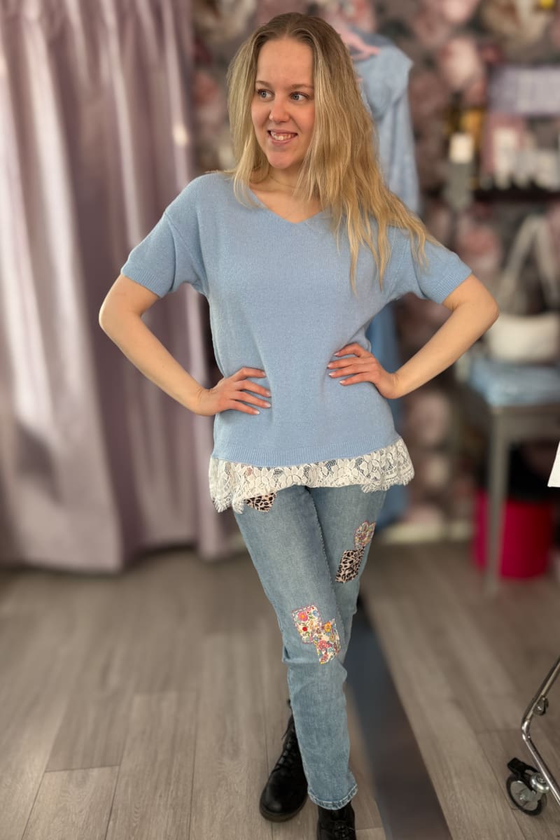 Lyhyet hihat tekevät neuleesta täydellisen kevääseen ja kesään. Se toimii sellaisenaan lämpimämpinä päivinä ja sopii myös kerrospukeutumiseen jakun tai neuletakin alle. Pitsihelma antaa asulle sen pienen erityisen yksityiskohdan, joka tekee tyylistä kiinnostavan eikä yhtään pliisun.
