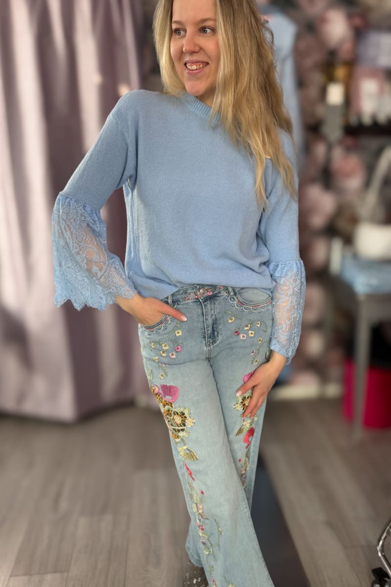 - Pehmeä neulepusero, jossa pitsihihat