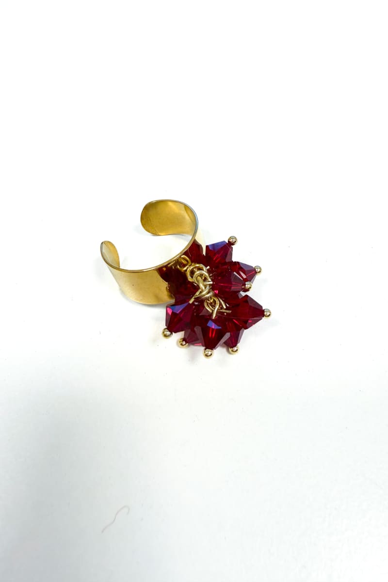 Sormus on valmistettu 18k. kullatusta kirurginteräksestä ja lasihelmistä sekä akryylikukista ja se on ihanan kevyt käytössä. Sormus on säädettävä, joten se käy kaikille.